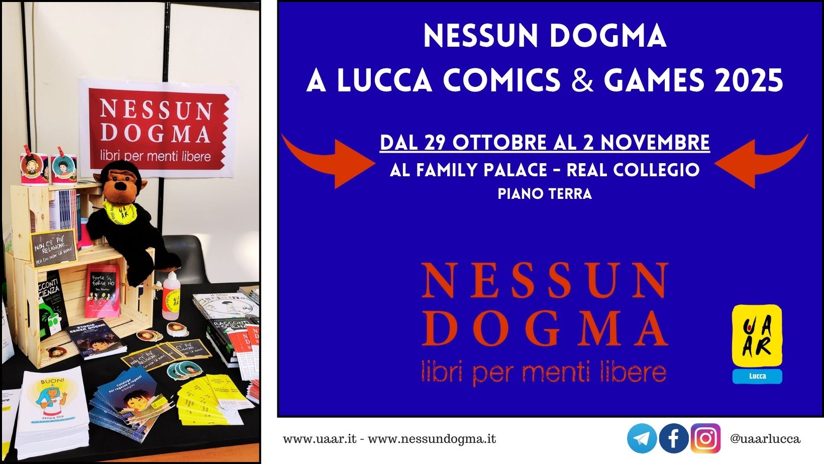 Dal 29 ottobre al 2 novembre Nessun Dogma sarà presente al Lucca Comics & Games 2025 allo stand RCJ153 presso il Family Palace (Real collegio, piano terra), grazie al volontari del gruppo Uaar di Lucca e del circolo Uaar di Firenze.
